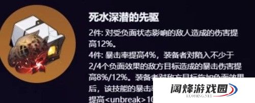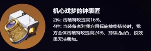 崩坏星穹铁道2.0新遗器: 【死水深潜的先驱】 2件效果:角色对有负面效果的敌人造成的伤害提高百分之12。 4件效果:装备者的暴击率提高百分之4,并且对不少于2/4个负面效果的敌人造成伤害时,提高自身百分之8/12的爆伤,持续1回合。 第一套是击破特攻套“机心戏梦的钟表匠”,两件套的效果是击破特攻提高16%,四件套效果是当装备者对我方目标施加终结技时,我方全体击破特攻提供24%,这个效果持续2个回合且无法叠加。毫无疑问,这是击破队辅助的新遗器,阮梅和艾丝妲专用。策划有意在2.0版本扶持击破队,后续还有配套的角色和光锥推出,目前版本并没有强力的击破C。