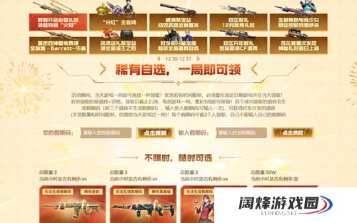 活动玩法: 1、对局领取奖励: 活动期间,当天游戏一局即可选择一件领取!奖池若有时间限制,必须要在指定日期游戏并在当天领取!若您领取的是道具+资格,领取后截止2.28,每周游戏一局,累积5周即可保留!首个成功领取的道具会生成假期码,输入他人假期码(可输入一次),可获得好友分享的道具 2、组队成功即领 3、为CFS10周年而造,全新黑骑士限时无条件领 领取即到仓库,领取后,截止1.31,只需游戏5局,即可一直保留!当天登录掌火后领取,即可减少1周续约。12月内需至少游戏1局,否则会提前回收道具。