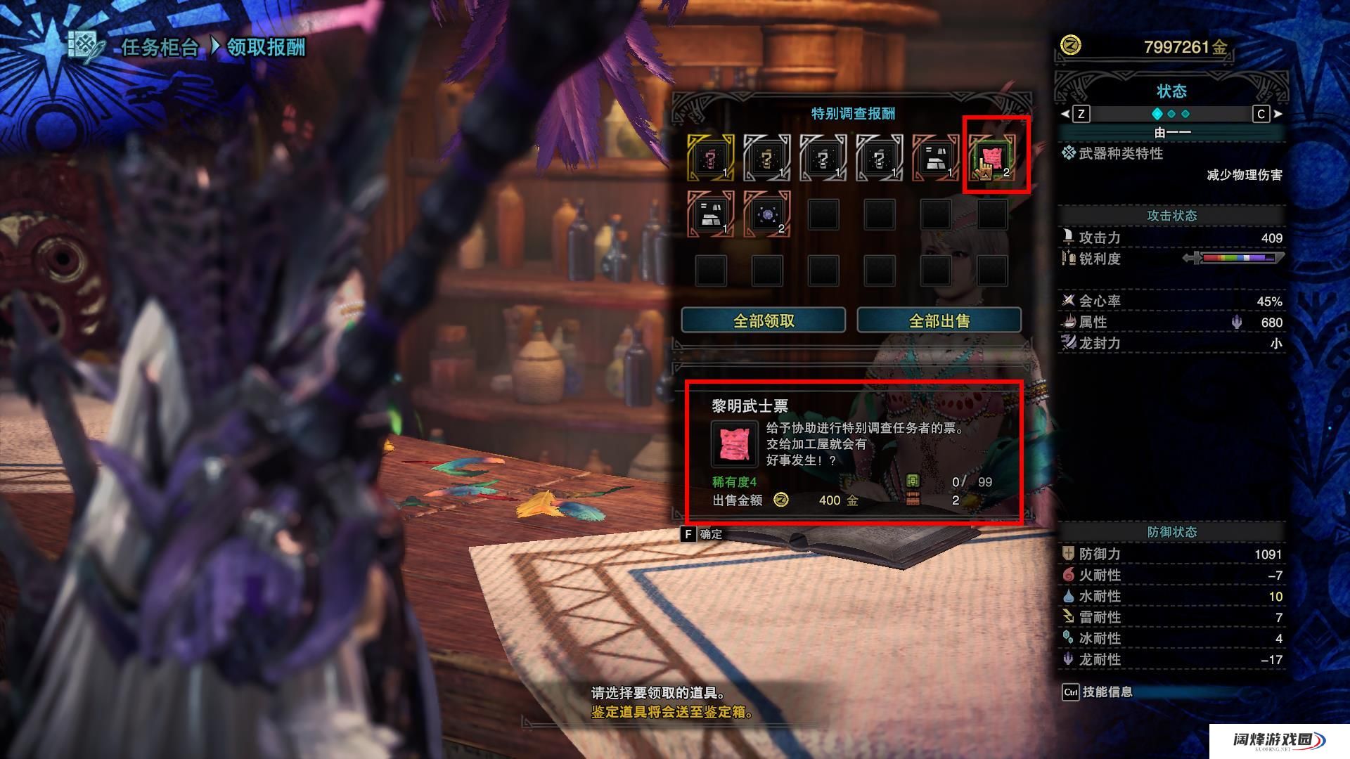 一旦烂辉龙调查度达到6级,你就可以在集会所招待处领取到黎明武士票了。