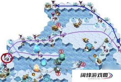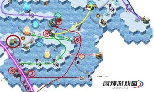 2、操作完④号,返回站在③号位置上,操作②号到高台上。先去⑤号位置操作一下,然后到⑥号发射雪球,这样就成功阻断了蓝色射线,右上方的高地入口就通了。