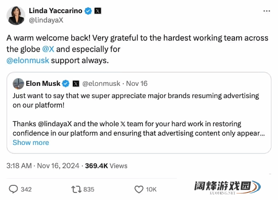 参考分析公司 MediaRadar 数据,迪士尼、康卡斯特(Comcast)、狮门娱乐(Lionsgate Entertainment)和华纳兄弟探索(Warner Bros. Discovery)等公司今年已经重新在 X 平台投放广告。 据悉,这些企业在 2024 年 1 月至 9 月期间在 X 平台的广告支出总计约为 330 万美元(当前约 2391.7 万元人民币),其中康卡斯特占了近 150 万美元(当前约 1087.1 万元人民币),华纳兄弟探索支出约 110 万美元(当前约 797.2 万元人民币),迪士尼约 55 万美元(当前约 398.6 万元人民币),狮门娱乐接近 23 万美元(当前约 166.7 万元人民币)。 尽管 330 万美元的广告投入相较于这些公司在 2023 年投入的 1.7 亿美元广告预算显得微不足道,但此举对于马斯克及 X 平台来说无疑是一种象征性的胜利。 随着广告商的回归,X 平台高管马斯克和琳达・雅卡里诺(Linda Yaccarino)也表示欢迎,马斯克在一则帖子中写道:“非常感谢各大品牌重新在我们平台投放广告!感谢琳达・雅卡里诺以及整个 X 团队为重建平台信任、确保广告内容只在广告商希望的地方展示所付出的努力。”