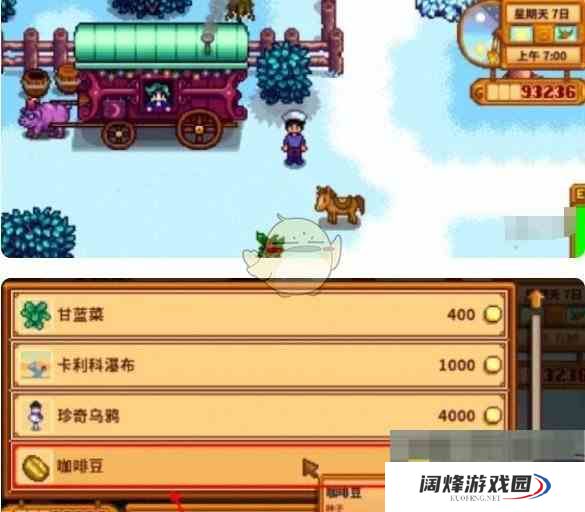 1、我们可以在猪车这里,和NPC互动后购买咖啡豆,猪车是随机刷新的;