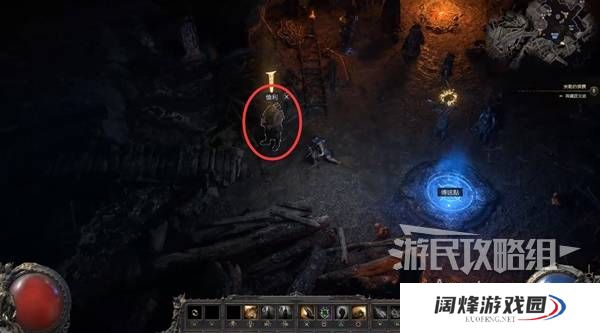屏幕右下角,下图圈出的按钮是回城功能,等初期到了第一个城市后,就可以用这个功能打开回城的传送门。