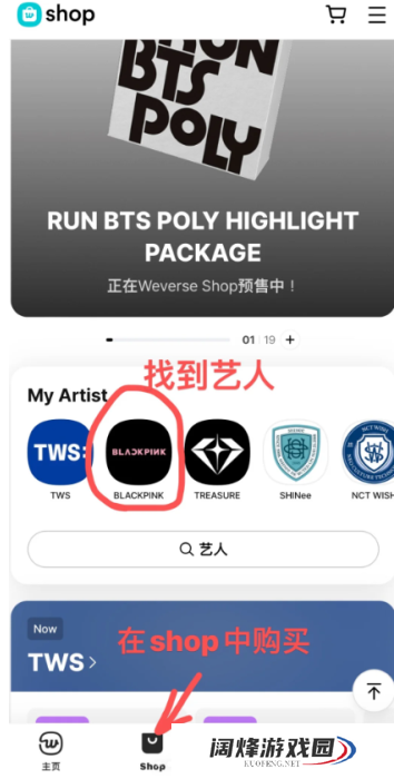 2,进入之后,点击下面的【shop】进入,找到自己要买的艺人,比如BLACKPINK;